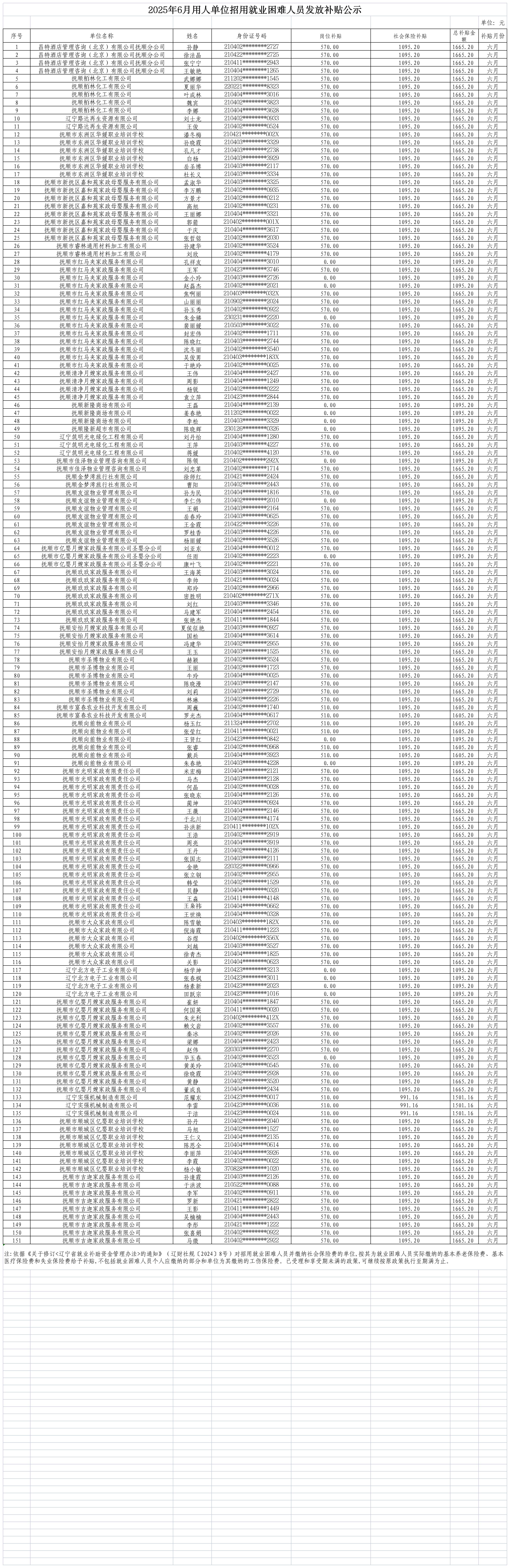 按照《关于修订<辽宁省就业补助资金管理办法>的通知》(辽财社规〔2024〕8号)规定,经过用人单位申报县区公共就业服务机构初审,市就业中心审核合格,对2025年6月享受补贴人员及单位明细予以公示。
